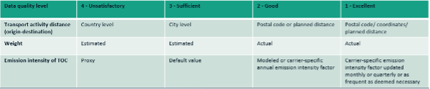 A key feature of ISO 14083:2023 is the emphasis on the quality of input data, using the indicators of “primary, modelled and default.” To further quantify the level of confidence stakeholders can have in the input data sources used in a certain calculation, Smart Freight Centre, with its guidance for End-to-End GHG Reporting of Logistics Operations, put forward an adapted “Data Quality Index” at the World Economic Forum in Davos (SFC, 2023). The approach introduces a weighted scoring system to evaluate the reliability and accuracy of the data used in emissions calculations.